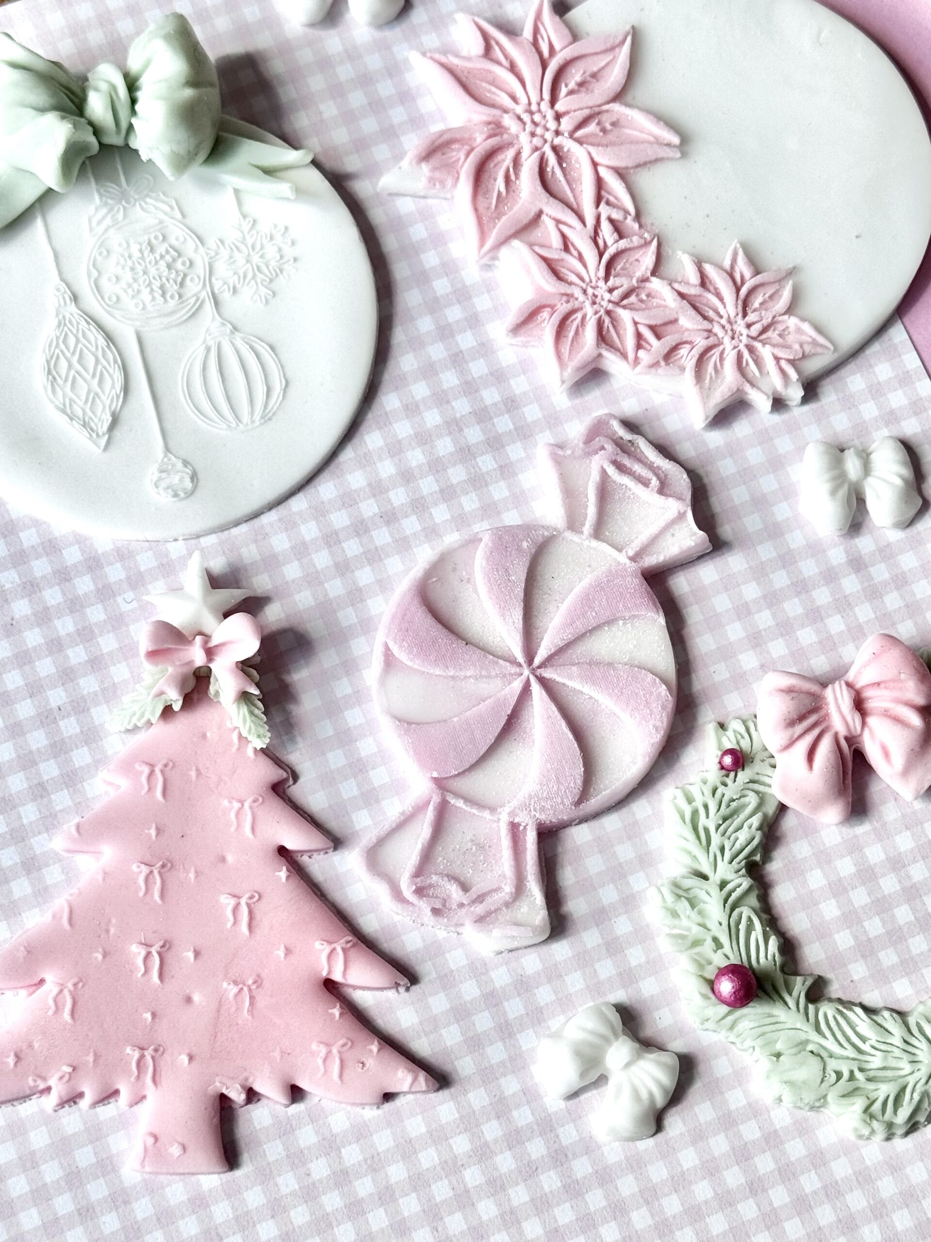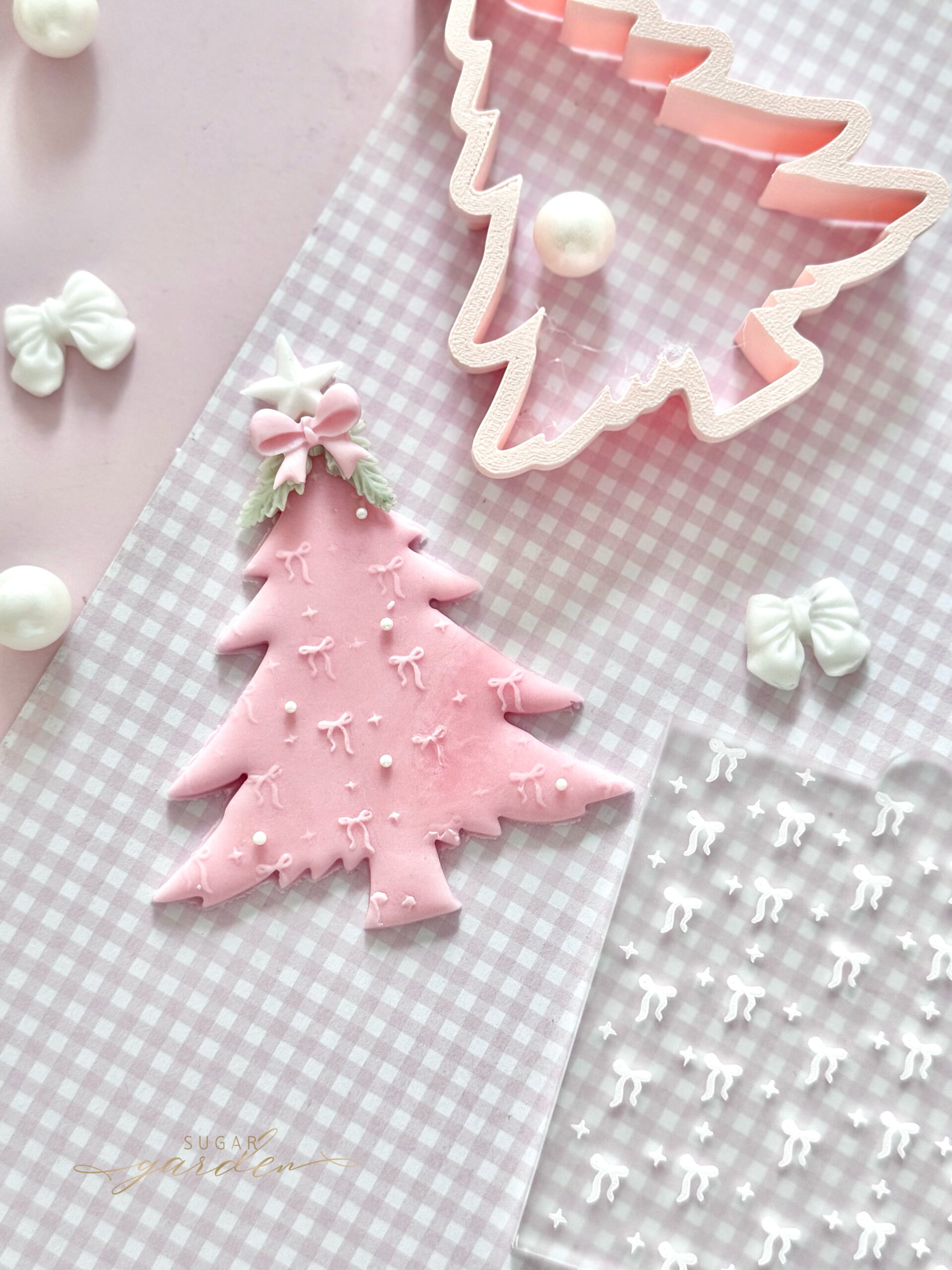 Met één handige tool maak je in een handomdraai perfecte kerstkoekjes of fondantdecoraties met een fijn reliëf van een sierlijke kerstboom versierd met strikjes.