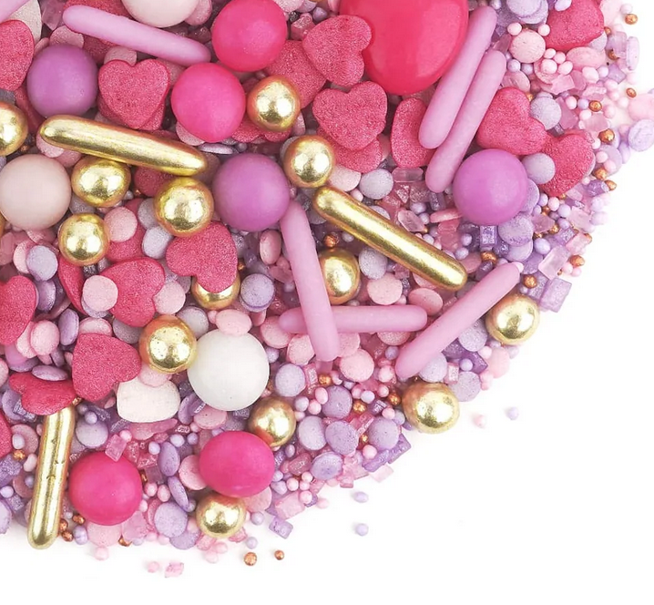 Onze RENDEZVOUS-sprinkles is de definitie en belichaming van romantiek. Het is het perfecte accent voor elk Valentijnsdagdessert, moederdag dankzij de prachtig harmonieuze combinatie van roze en delicaat paars en veel hartvormige confetti. Het zal ongetwijfeld zoetigheid toevoegen aan elke taart of cupcake, waardoor een charmante en liefdevolle compositie ontstaat.