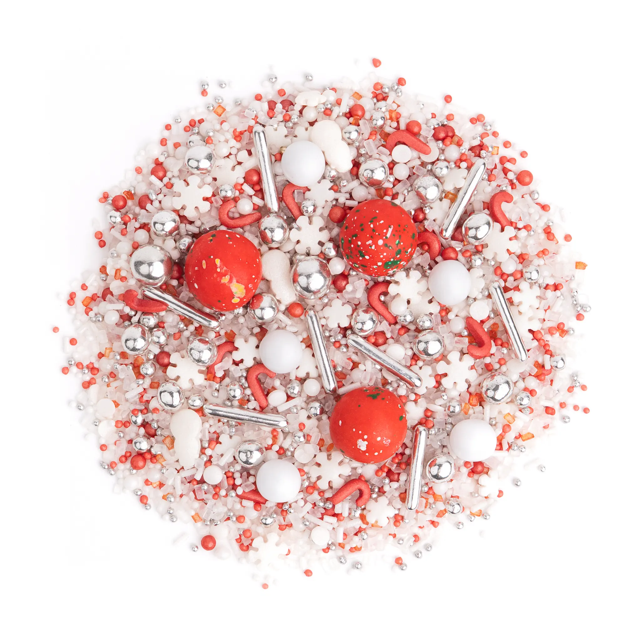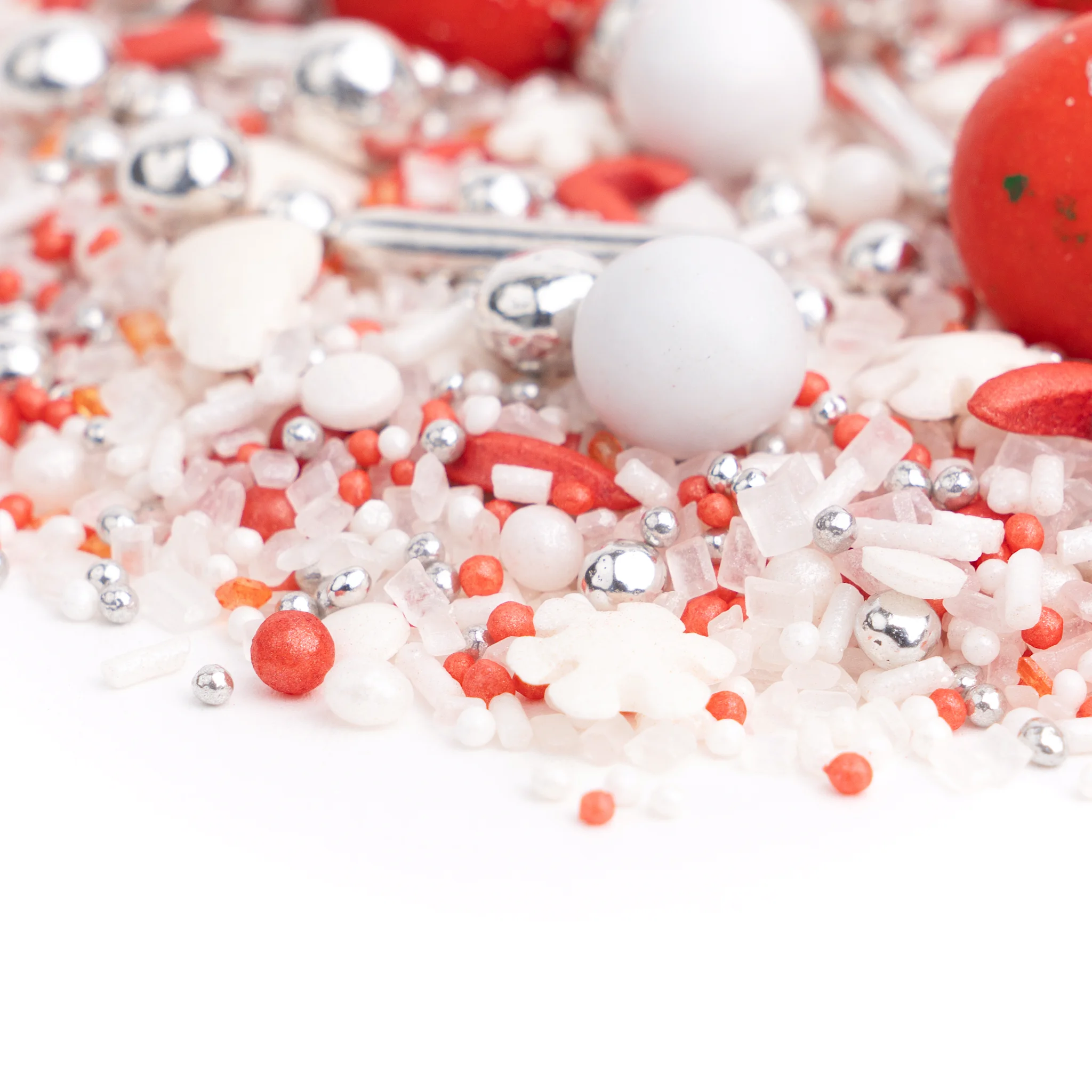 Deze magische mix is wit als sneeuw, met talloze rode accenten en heerlijke zachte peperkoekballetjes. Alles wordt afgemaakt met zilveren details, chocoladeparels in verschillende maten, schitterende macaronis en suikerige sneeuwvlokken.